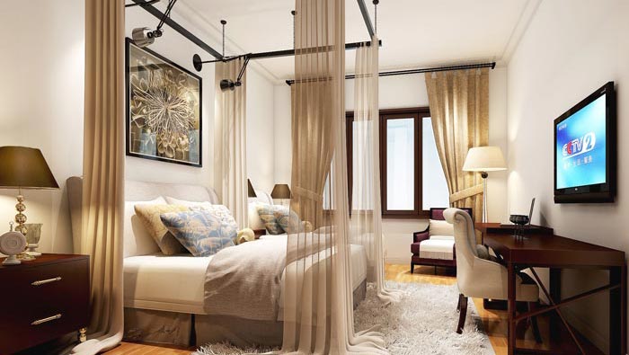 雙人間的設計:此處給人最溫柔的就是地面柔柔的地毯,在這里客戶可以赤足在屋中走動,讓大家感受到赤足而走的感受,設計師希望讓大家明白,自己有多少時間沒有好好的放縱一下了,自己有多少時間沒有為自己好好活著了,人生本身是美好的,設計師希望我們去正對他。