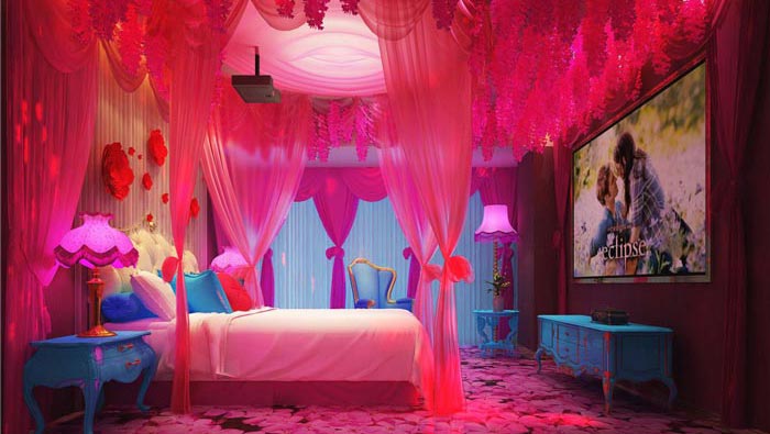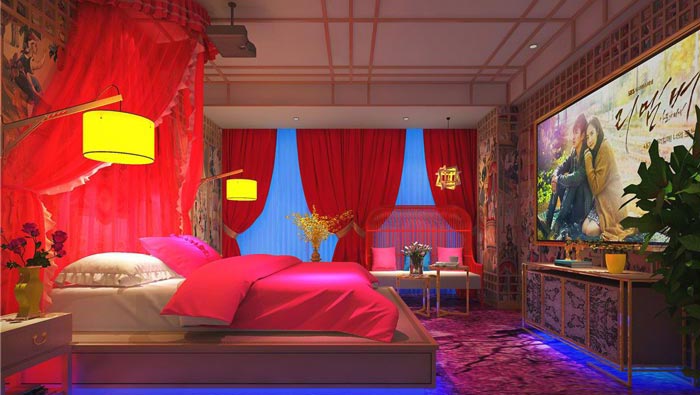 喜慶客房的設計:此處粉紅色成為主角,在這里是一個粉紅的世界,情侶們在這里仿佛脫離了世界一般,來到了一個全新的星球之中,在這里他們浪跡天涯,在這里他們相互依偎,客房的含義重在折射出內心的希望,也意在促進雙方內心的互動。