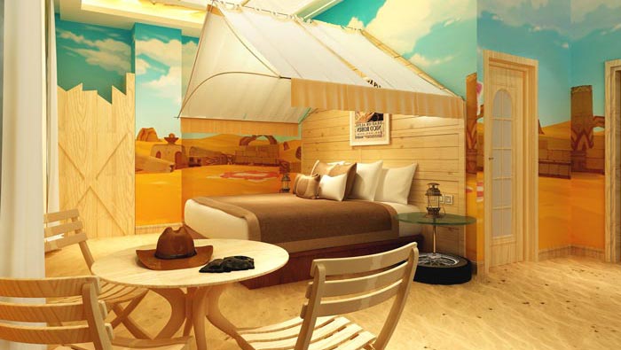 沙漠客房的設計:提起沙漠人們的第一印象就是荒漠,但是在設計師的眼中卻不是如此,在設計師看來沙漠不是生來就是沙漠,而是經過歷史的不斷演變,最后變成了我們現在熟悉的模樣,設計師希望恢復沙漠之前的模樣,與現在的沙漠進行對比,以此形成的鮮明對比,讓大家在住店的同時,也能引起大家的反思。