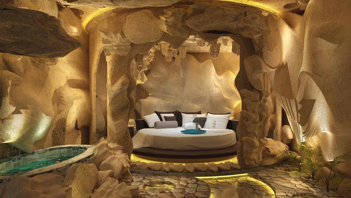 spa客房的設計:此處要是不知道還真以為是在山洞當中的酒店,在設計師看來人們現在需要的是一個安寧之所,此處給人的第一感覺就是心曠神怡,其中冬暖夏涼也繼承了山洞的屬性,設計師這樣做就是做到百分百相似,讓人在城市中可以體會到自然的神奇。