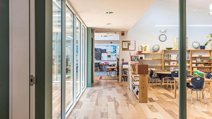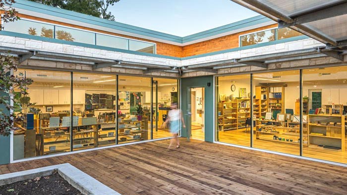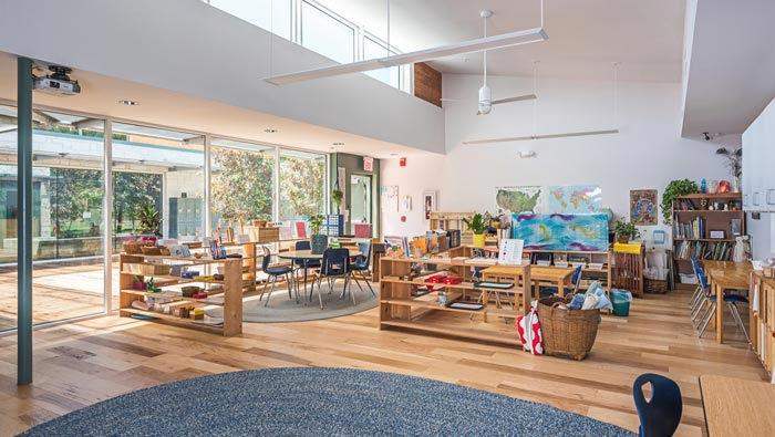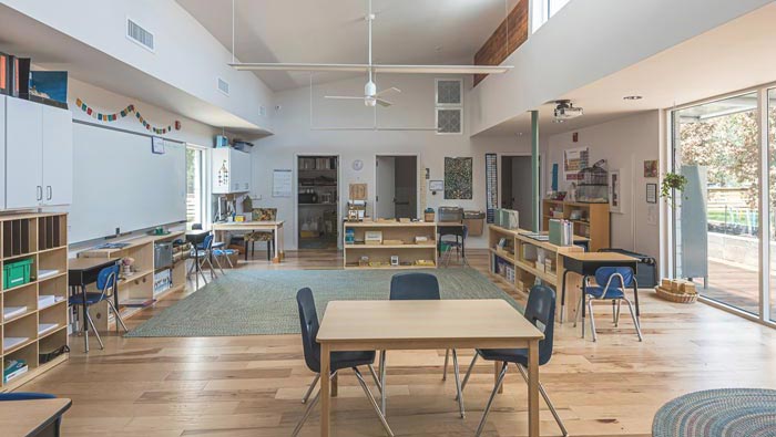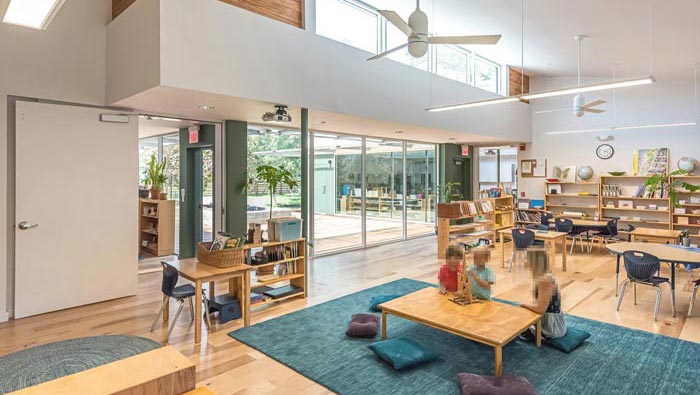 教學(xué)區(qū)域的設(shè)計(jì):細(xì)細(xì)看去空間給我們的感覺(jué)是那么的自然,這也是設(shè)計(jì)師希望得到的設(shè)計(jì)氛圍,在設(shè)計(jì)師看來(lái)內(nèi)部表現(xiàn)出室內(nèi)的氣候循環(huán),也更能讓孩子們喜歡這里,通過(guò)調(diào)查孩子們喜歡的戶外,因?yàn)樵趹敉夂⒆觽兛梢詿o(wú)憂無(wú)慮,此處就是結(jié)合孩子的天性,讓孩子們喜歡這里、愛(ài)上這里。